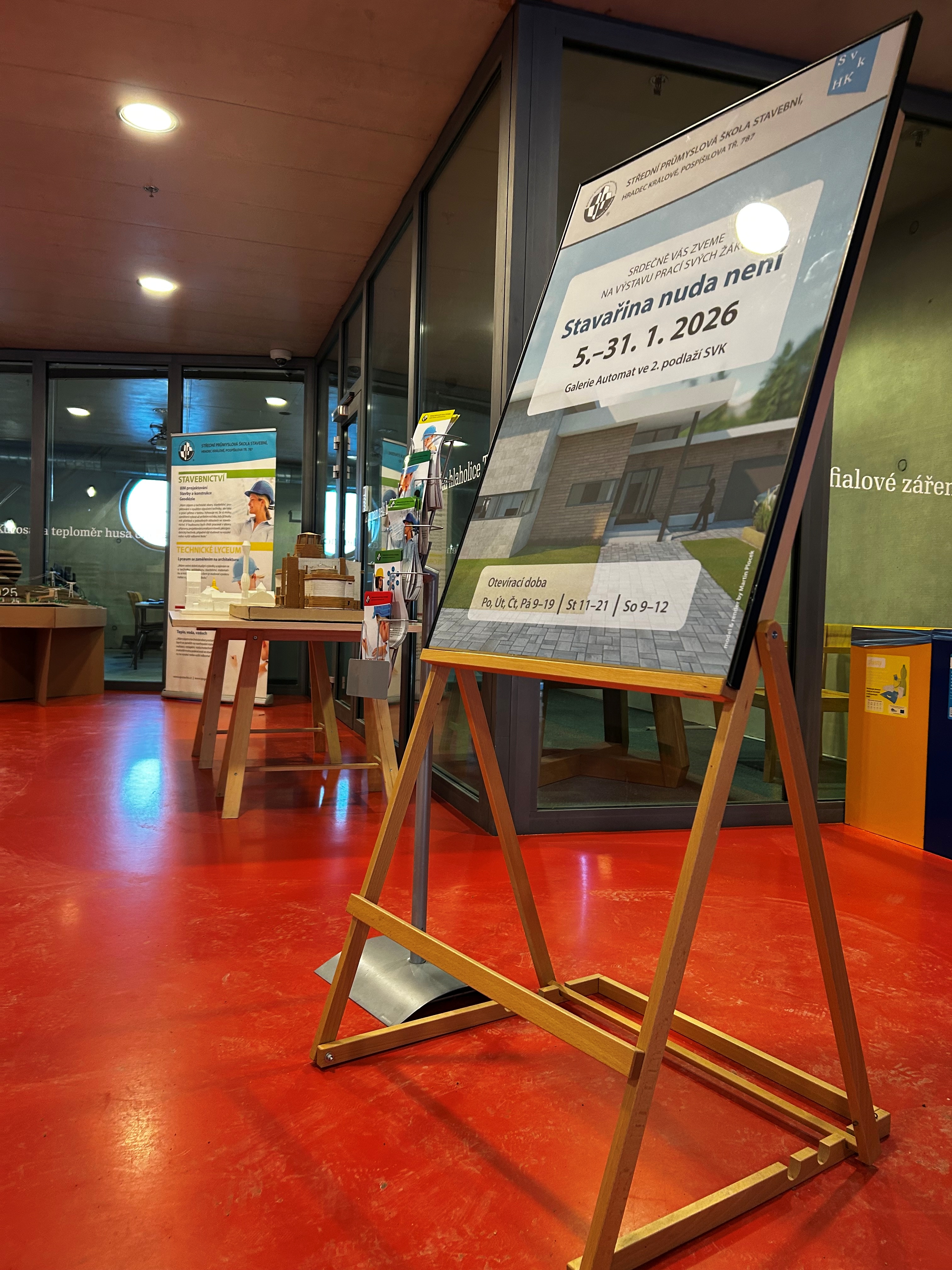 Výstavu Stavařina nuda není jsme pro vás připravili již pošestnácté. V galerii Automat ve druhém patře Studijní a vědecké knihovny v Hradci Králové si od pondělí 5. 1. až do konce ledna můžete prohlédnout vystavené maturitní, ročníkové a soutěžní práce žáků naší školy. Součástí výstavy jsou i ukázky modelů a prací zhotovených v předmětech architektura, průmyslové výtvarnictví, technické kreslení a výtvarná výchova.